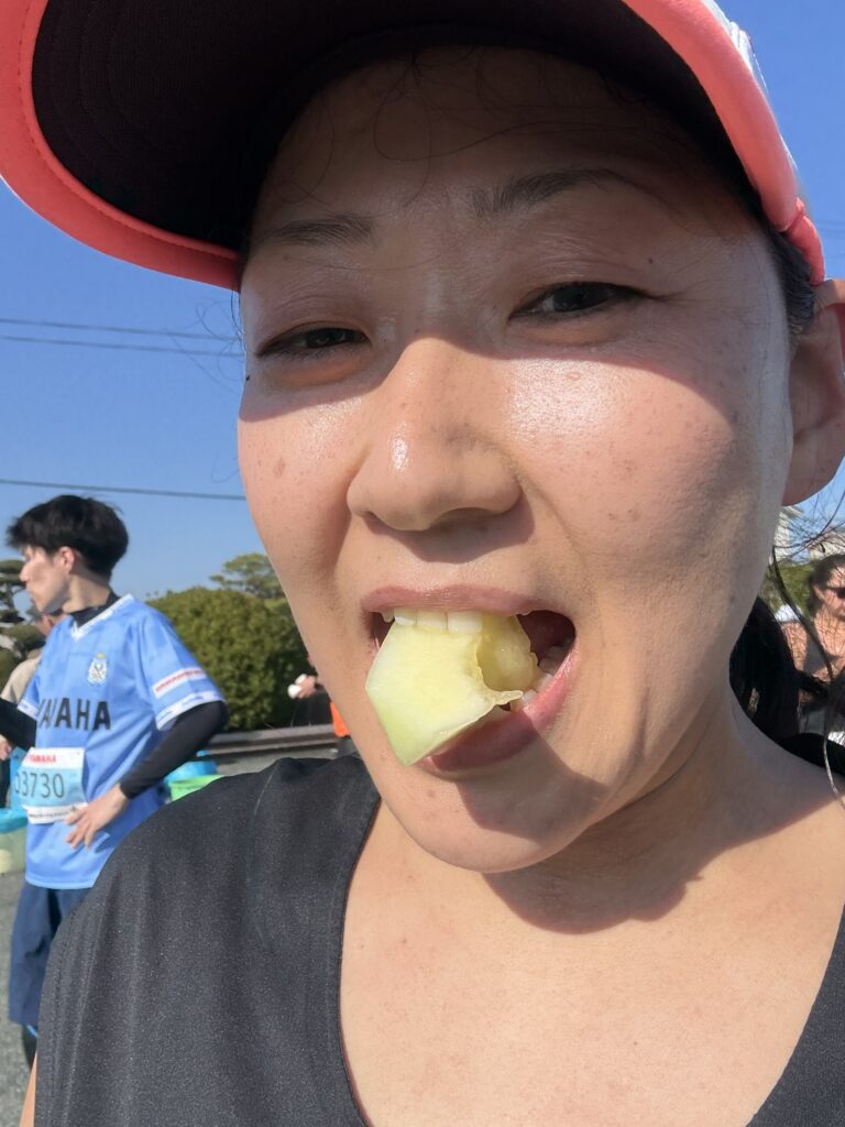 ジュビロマラソンは初めてでしたが、途中11キロあたりで、メロンとイチゴをいただきました!